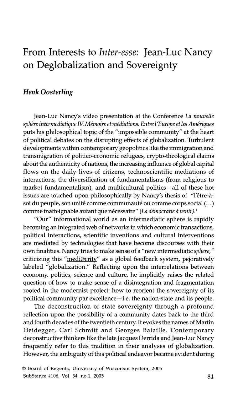 2005 "From Interests to Inter-esse. Nancy on Deglobalization and Sovereignty"